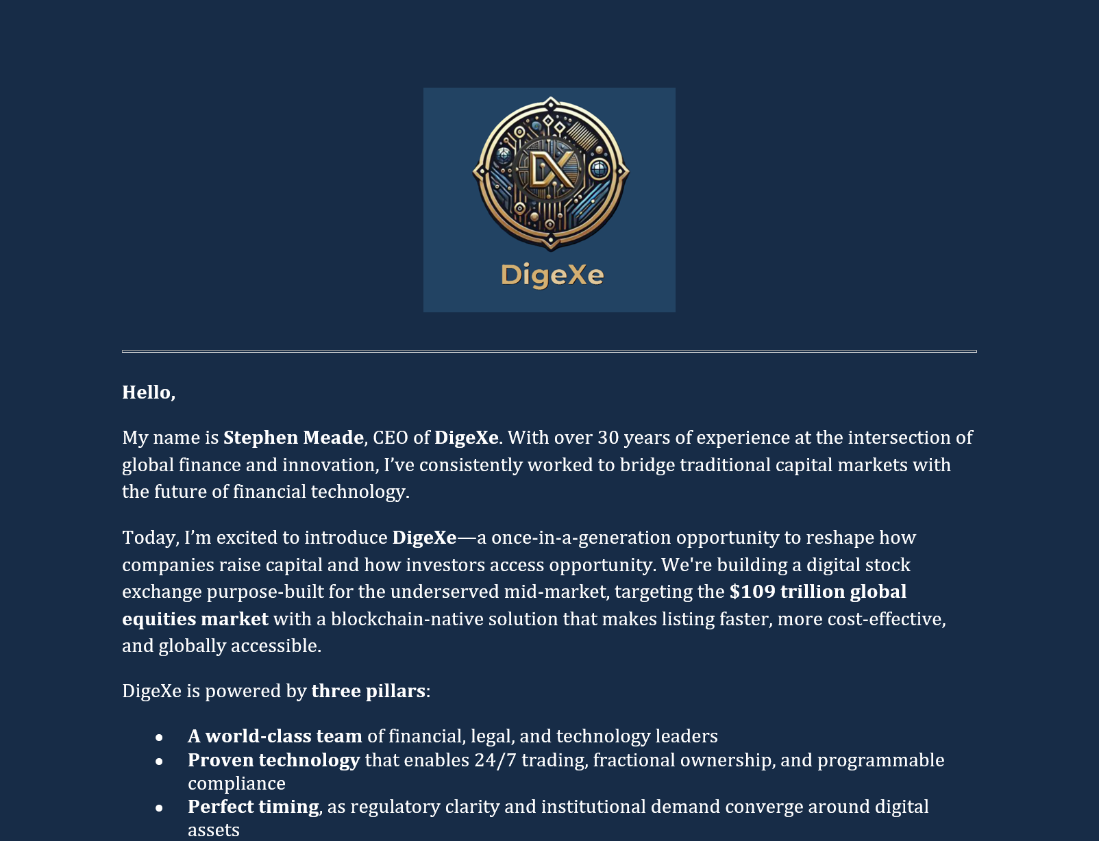 Today, I present an extraordinary opportunity with DigeXe—a once-in-a-generation chance to reshape financial markets for the 21st century. We are transforming the way companies and projects raise capital by issuing digital assets, enabling global participation via digital exchanges.